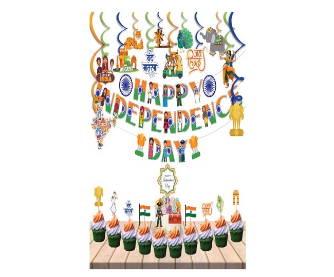 Independence Day 2023 को यादगार बनाने के लिए यह बैनर 1 पीसी केक टॉपर, 10 पीसी कपकेक टॉपर, रिबन के साथ बैनर का 1 सेट, कटआउट के साथ 12 पीसी स्विर्ल्स और 12 पीसी स्विर्ल रिबन के साथ आता है। यह एकदम किफायती कीमत पर मिलता है।