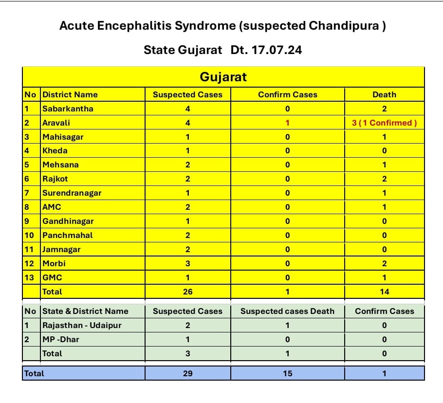 गुजरात में अब तक चांदीपुरा वायरस संक्रमण के 14 संदिग्ध मामले सामने आ चुके हैं। इनमें से आठ मरीजों की मौत हो चुकी है। राज्य के स्वास्थ्य मंत्री रुशिकेश पटेल ने कहा कि उनके सभी नमूने पुष्टि के लिए पुणे स्थित एनआईवी को भेजे गए थे।