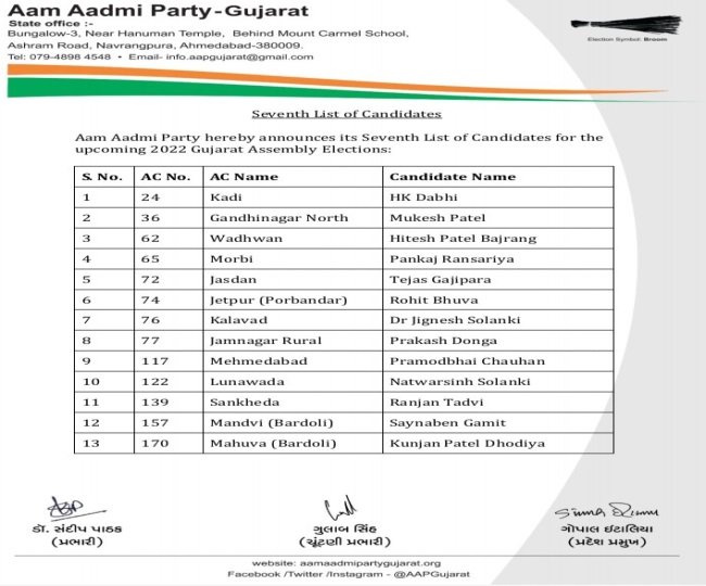 गुजरात विधानसभा चुनाव 2022 के लिए आम आदमी पार्टी ने अपने उम्मीदवारों की सातवीं सूची जारी की है। इस सूची में 13 उम्मीदवारों के नाम का एलान किया गया है। गुजरात में इसी साल के अंत में विधानसभा चुनाव होने वाले हैं।