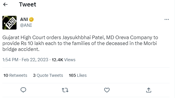Morbi bridge collapse 2022 गुजरात हाईकोर्ट ने ओरेवा कंपनी के एमडी जयसुखभाई पटेल को मोरबी पुल हादसे में मृतकों के परिजनों को 10-10 लाख रुपये देने का आदेश दिया है। वहीं घायलों को 2-2 लाख रुपये का मुआवजा देने को कहा है।