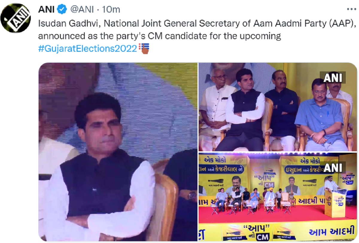 गौरतलब है कि केजरीवाल ने गुजरात में पार्टी के सीएम चेहरे के लिए जनता से सुझाव मांगा था। केजरीवाल ने सीएम पद का उम्मीदवार घोषित करते हुए कहा, 'हमारे पास 16 लाख 48 हजार से ज्यादा सुझाव आए। इनमें से करीब 73 फीसदी लोगों ने ईसुदान गढ़वी जी का नाम चुना।' गढ़वी के नाम की घोषणा होते ही वह भावुक हो गए और अपनी मां का आशीर्वाद लिया।