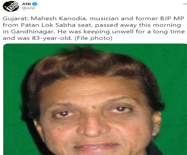 अहमदाबाद, एएनआइ। Mahesh Kanodia Passes Away: गुजरात में पाटन लोकसभा सीट से संगीतकार और पूर्व भाजपा सांसद महेश कनोडिया का रविवार सुबह गांधीनगर में निधन हो गया। वह लंबे समय से अस्वस्थ थे और 83 साल के थे। इस बीच, पीएम नरेंद्र मोदी ने महेश कनोडिया के निधन पर शोक जताया है।पीएम मोदी ने ट्वीट में लिखा कि महेश कनोडिया के निधन से अत्यंत दुख हुआ है। वे एक बहुमुखी प्रतिभा संपन्न गायक थे, जिन्हें लोगों का भरपूर प्यार मिला। एक राजनेता के रूप में भी वे गरीबों और पिछड़ों के सशक्तिकरण के लिए समर्पित रहे। हितु कनोडिया से मैंने बात की और उनके परिजनों के प्रति संवेदनाएं प्रकट की।