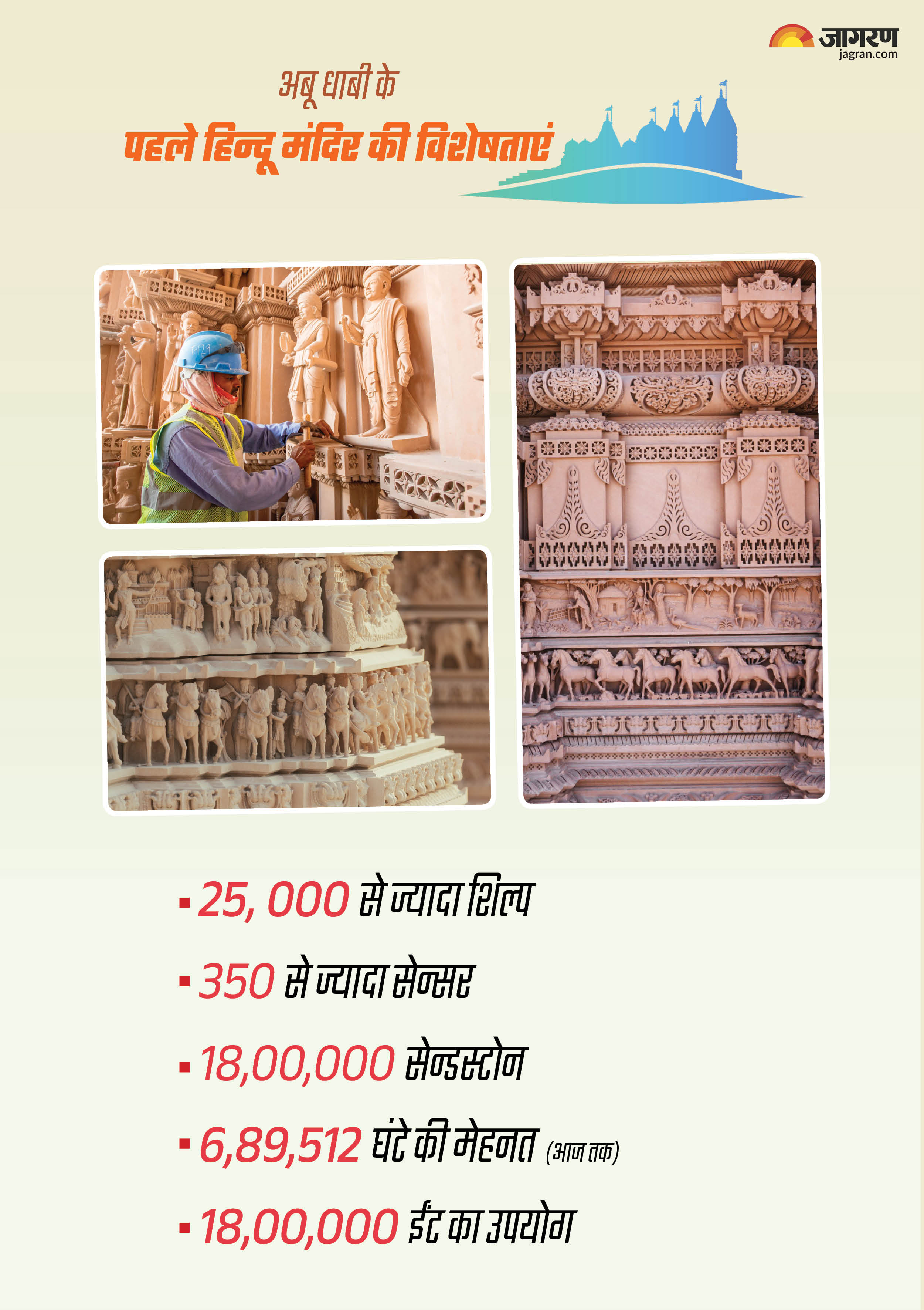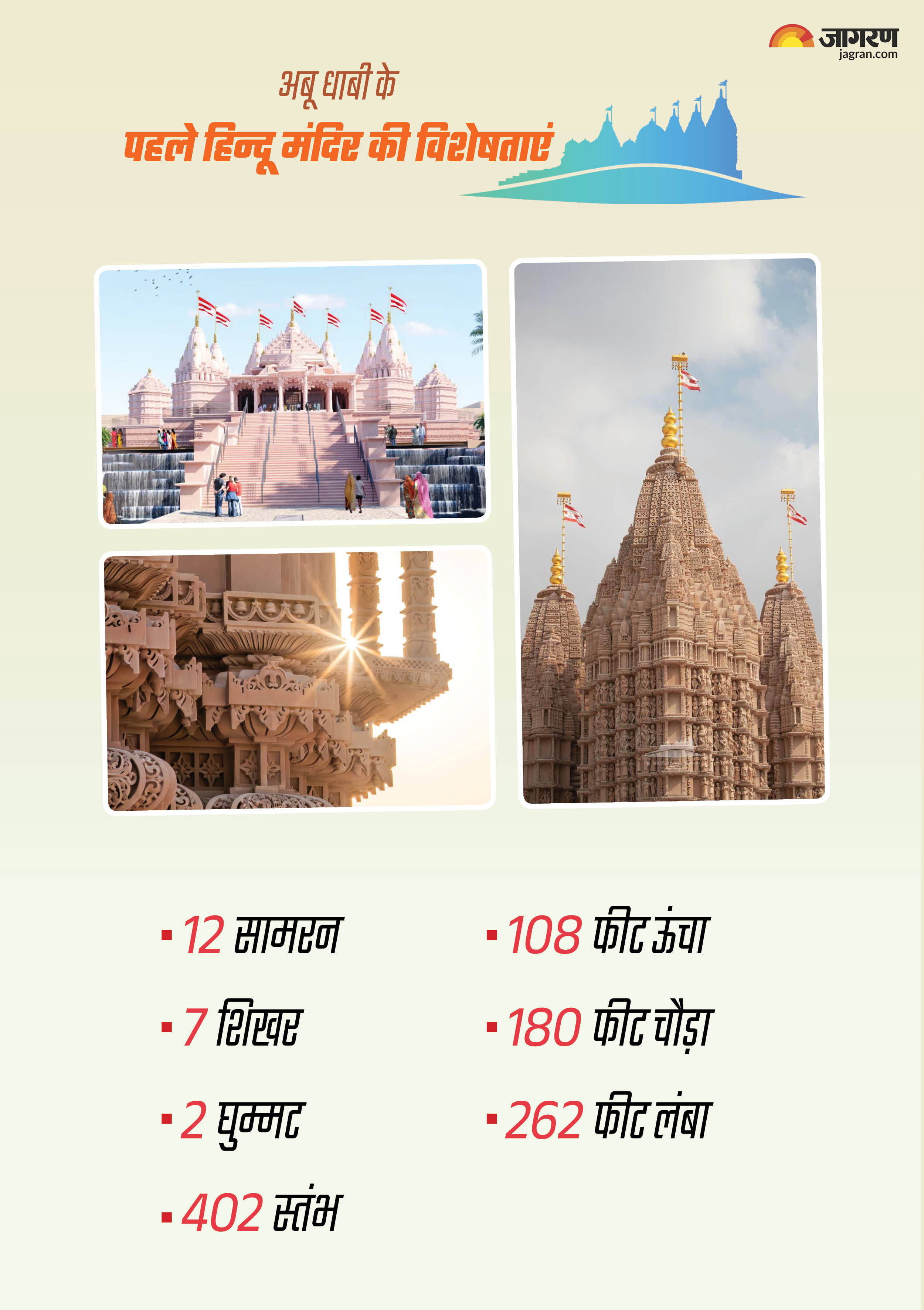 किशन प्रजापति, अहमदाबाद। Hindu Temple In UAE : आज से साल 2024 की शुरुआत हो रही है। ये साल हर हिंदू के लिए यादगार रहेगा. क्योंकि, इसी 22 जनवरी को अयोध्या में राम मंदिर की भव्य प्राण प्रतिष्ठा होगी। 14 फरवरी को मुस्लिम देश अबू धाबी में पहले हिंदू मंदिर (BAPS मंदिर) का उद्घाटन किया जाएगा। अबू धाबी में आस्था, संस्कृति, सद्भावना और सभ्यता का प्रतीक BAPS मंदिर का निर्माण अंतिम चरण में है। भारत से लगभग ढाई हजार किलोमीटर दूर 27 एकड़ में हजारों भक्तों की मेहनत से और संतों के मार्गदर्शन में यह मंदिर आकार ले रहा है।