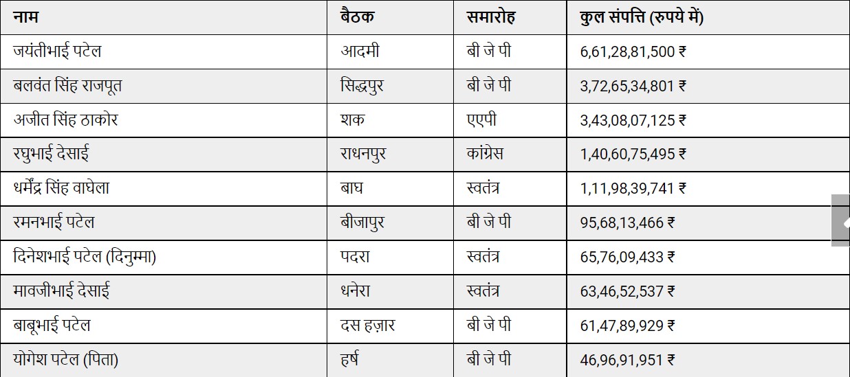 सभी उम्मीदवारों ने अपनी संपत्ति सहित सभी विवरणों के साथ एक हलफनामा प्रस्तुत किया है। चुनाव के दौरान वोटर्स की हमेशा जिज्ञासा रहती है कि आखिर राज्य में सबसे अमीर उम्मीदवार कौन है। तो आइए हम आपको बताते हैं कि गुजरात विधानसभा चुनाव के दूसरे चरण के टॉप 10 सबसे अमीर उम्मीदवार कौन हैं। एडीआर की रिपोर्ट के मुताबिक मनसाना जयंती पटेल के पास सबसे ज्यादा 661 करोड़ रुपए से ज्यादा की संपत्ति है। जयंती पटेल बीजेपी के उम्मीदवार हैं। बता दें कि चुनाव के नतीजे दो दिन बाद 8 दिसंबर को आएंगे।