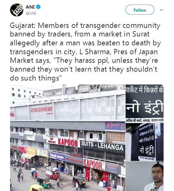 अहमदाबाद, एएनआइ। Transgender No entry सूरत के बाजार में व्यापारियों ने किन्नर समुदाय से संबंधित लोगों के आने पर प्रतिबंध लगा दिया है, इसके लिए पूरी मार्केट में बकायदा 'मार्केट में किन्नर की नो इंट्री' के पोस्टर भी लगा दिये गये हैं। गौरतलब है कि किन्नरों द्वारा मार्केट में एक शख्स को पीट-पीटकर मारने के बाद व्यापारियों ने किन्नरों की नो इंट्री का निर्णय लिया है।