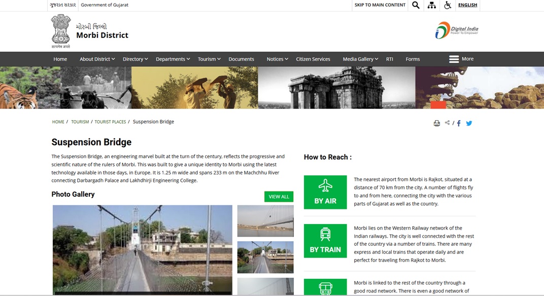 पर्यटन वेबसाइट पर मोरबी ब्रिज को 19वीं सदी के यूरोप जैसा बताते हुए “संकरी पत्थर की गलियों और ऐतिहासिक इमारतों” का उल्लेख किया गया है। ब्रिज को “विक्टोरियन लंदन की याद दिलाने वाला” और “उस युग का कलात्मक और तकनीकी चमत्कार” बताया गया है।