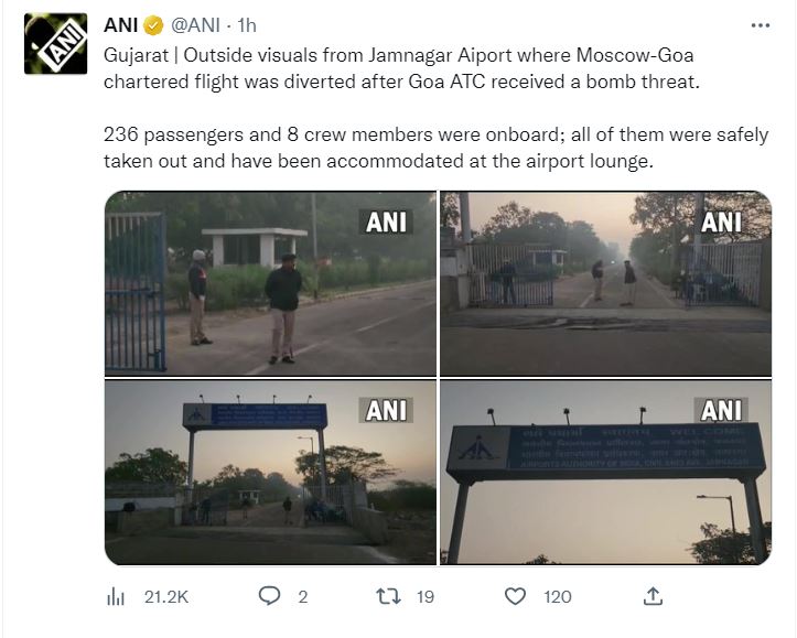 गोवा एटीसी को बम की धमकी मिलने के बाद बीती रात मॉस्को-गोवा चार्टर्ड फ्लाइट को जामनगर डायवर्ट किया गया था। pic.twitter.com/FnvUd5mobN