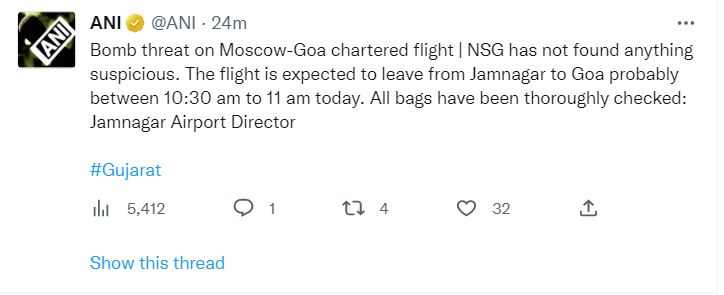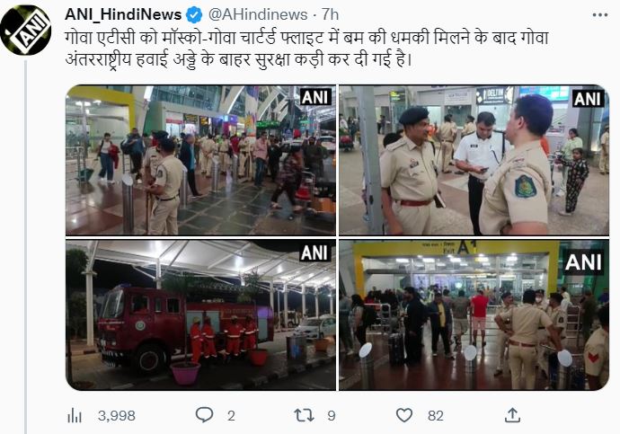मॉस्को-गोवा चार्टर्ड फ्लाइट में कुछ संदिग्ध नहीं मिलने के बाद फ्लाइट जामनगर से गोवा के लिए रवाना हुई।