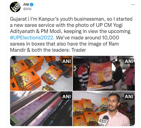 अहमदाबाद, एएनआइ। उत्तर प्रदेश चुनाव 2022 (UP Election 2022) को ध्यान में रखते हुए गुजरात (Gujarat) में रहने वाले कानुपर के एक व्यवसायी (Kanpur's youth businessman) ने एक नई साड़ी सेवा (New Saree Service ) की शुरुआत की है। इसके लिए अनोखी साड़ियां तैयार की गई हैं। इस साड़ियों कि खासियत ये है कि इन पर भाजपा (BJP) का चुनाव चिह्न कमल का फूल, उत्तर प्रदेश के मुख्यमंत्री योगी आदित्यनाथ ( Yogi Adityanath) और प्रधानमंत्री नरेन्द्र मोदी (Narender Modi) की तस्वीर छपी हुई है। व्यवसायी ने बताया कि हमने 10 हजार साड़ियां तैयार की है जिन्हें खास तरह के डिब्बों रखा गया है। ये डिब्बे इसलिए खास हैं क्योंकि इन पर राम मंदिर (Ram Mandir) का चित्र बना हुआ है।