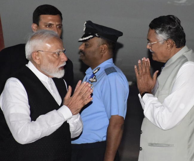 एएनआई, अहमदाबाद। प्रधानमंत्री नरेंद्र मोदी शनिवार को तीन दिवसीय यात्रा पर गुजरात पहुंचे हैं। पीएम मोदी का विमान जामनगर हवाई अड्डे पर उतरा। इसके बाद उन्होंने जामनगर सर्किट हाउस में रात्रि विश्राम किया। उन्हें सर्किट हाउस की पहली मंजिल पर स्थित रंगमती कक्ष में ठहराया गया था।