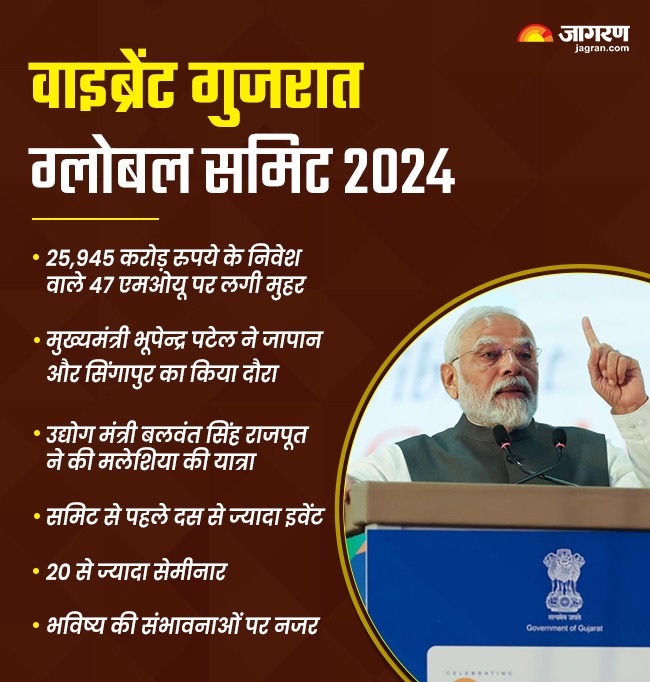 गुजरात में अगले साल वाइब्रेंट गुजरात ग्लोबल समिट 2024 का आयोजन किया जा रहा है। इस इवेंट की थीम गेटवे टू द फ्यूचर रखी गई है। इस इवेंट को भविष्य की जरूरतों चुनौतियों और संभावनाओं को लेकर डिजाइन किया गया है। नवंबर में राज्य सरकार द्वारा जारी आंकड़ों में कहा गया है कि 25945 करोड़ रुपये के निवेश वाले 47 एमओयू अब तक मुहर लग चुकी है।