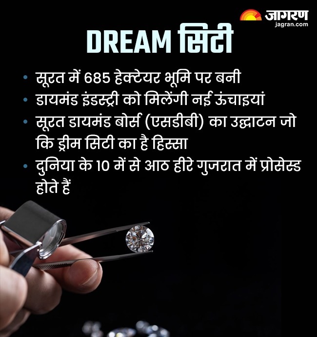 गुजरात की डायमंड रिसर्च एंड मर्चेंटाइल (DREAM) सिटी सूरत में 685 हेक्टेयर भूमि पर बनी है। इस सिटी को इस तरीके से डिजाइन किया गया है कि यह डायमंड इंडस्ट्री की भविष्य में आने वाली चुनौतियों को हल करने में सक्षम होगी।