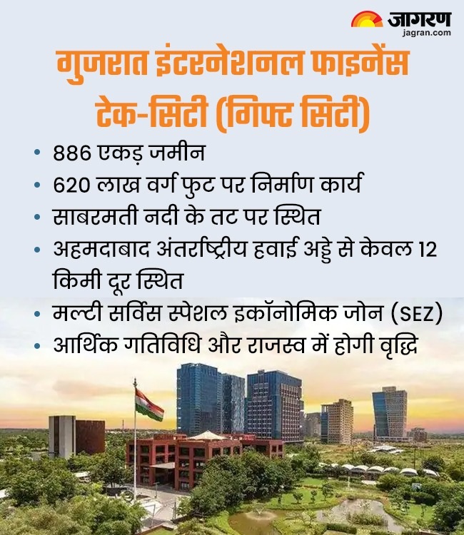 गिफ्ट सिटी 886 एकड़ जमीन पर फैली है। इस सिटी में 620 लाख वर्ग फुट पर निर्माण कार्य हुआ है। इस सिटी में ऑफिस स्पेस, आवासीय, स्कूल, अस्पताल, होटल, क्लब, खुदरा और विभिन्न मनोरंजन सुविधाएं शामिल हैं। GIFT साबरमती नदी के तट पर स्थित है, जो गुजरात की व्यापारिक राजधानी (अहमदाबाद) और राजनीतिक राजधानी (गांधीनगर) को जोड़ता है। गुजरात राज्य भारत के विकास का इंजन बना हुआ है। हवाई कनेक्टिविटी के लिहाज से यह बेहतरीन जगह पर है। यह अहमदाबाद अंतर्राष्ट्रीय हवाई अड्डे से केवल 12 किमी दूर स्थित है।