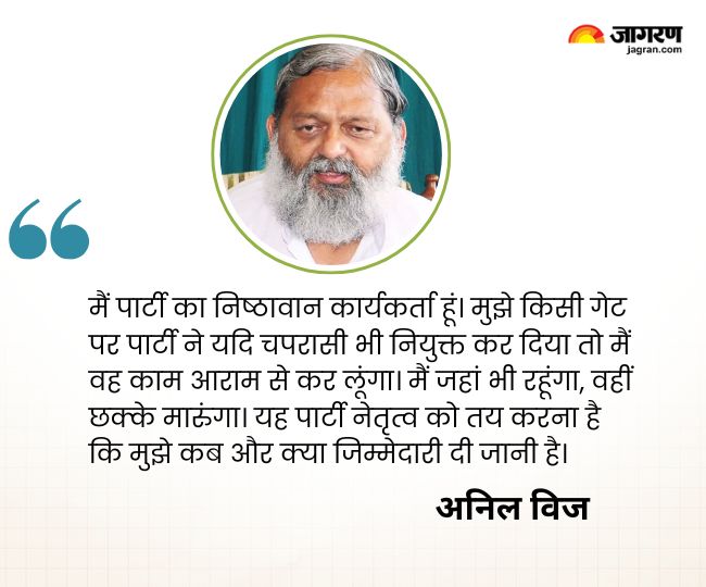अनिल विज ने बुधवार को कहा कि मैं पार्टी का निष्ठावान कार्यकर्ता हूं। मुझे किसी गेट पर पार्टी ने यदि चपरासी भी नियुक्त कर दिया तो मैं वह काम आराम से कर लूंगा। मैं जहां भी रहूंगा, वहीं छक्के मारुंगा। यह पार्टी नेतृत्व को तय करना है कि मुझे कब और क्या जिम्मेदारी दी जानी है।