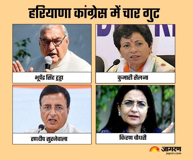 हरियाणा कांग्रेस में चार गुट हैं, जिनकी चर्चा हर चुनाव से पहले होती है। एक गुट है पूर्व मुख्यमंत्री भूपेंद्र सिंह हुड्डा का, एक गुट है पूर्व कांग्रेस प्रदेश अध्यक्ष कुमारी सैलजा का, एक गुट है पूर्व सीएलपी लीडर किरण चौधरी का और एक गुट है कांग्रेस के राष्ट्रीय महासचिव रणदीप सुरजेवाला का। समय-समय पर इन गुटों में कलह देखने को मिली है।