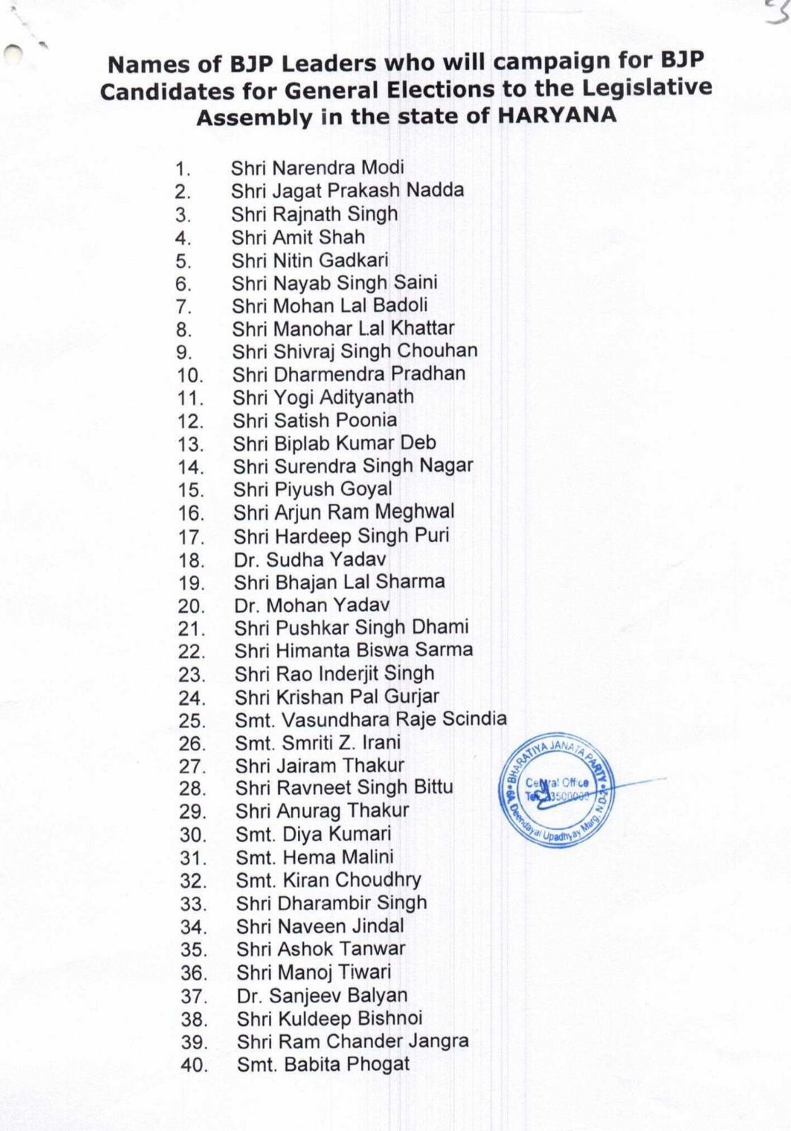 स्टार प्रचारकों की सूची में केंद्रीय मंत्री राजनाथ सिंह, नितिन गडकरी, पूर्व मुख्यमंत्री मनोहर लाल, शिवराज सिंह चौहान और पीयूष गोयल सहित कई नेताओं के नाम शामिल हैं। कई राज्यों के मुख्यमंत्री भी हरियाणा में चुनाव प्रचार करेंगे। योगी आदित्यनाथ, मोहन यादव, हिमंत बिस्वा सरमा, भजन लाल शर्मा, पुष्कर सिंह धामी करेंगे।