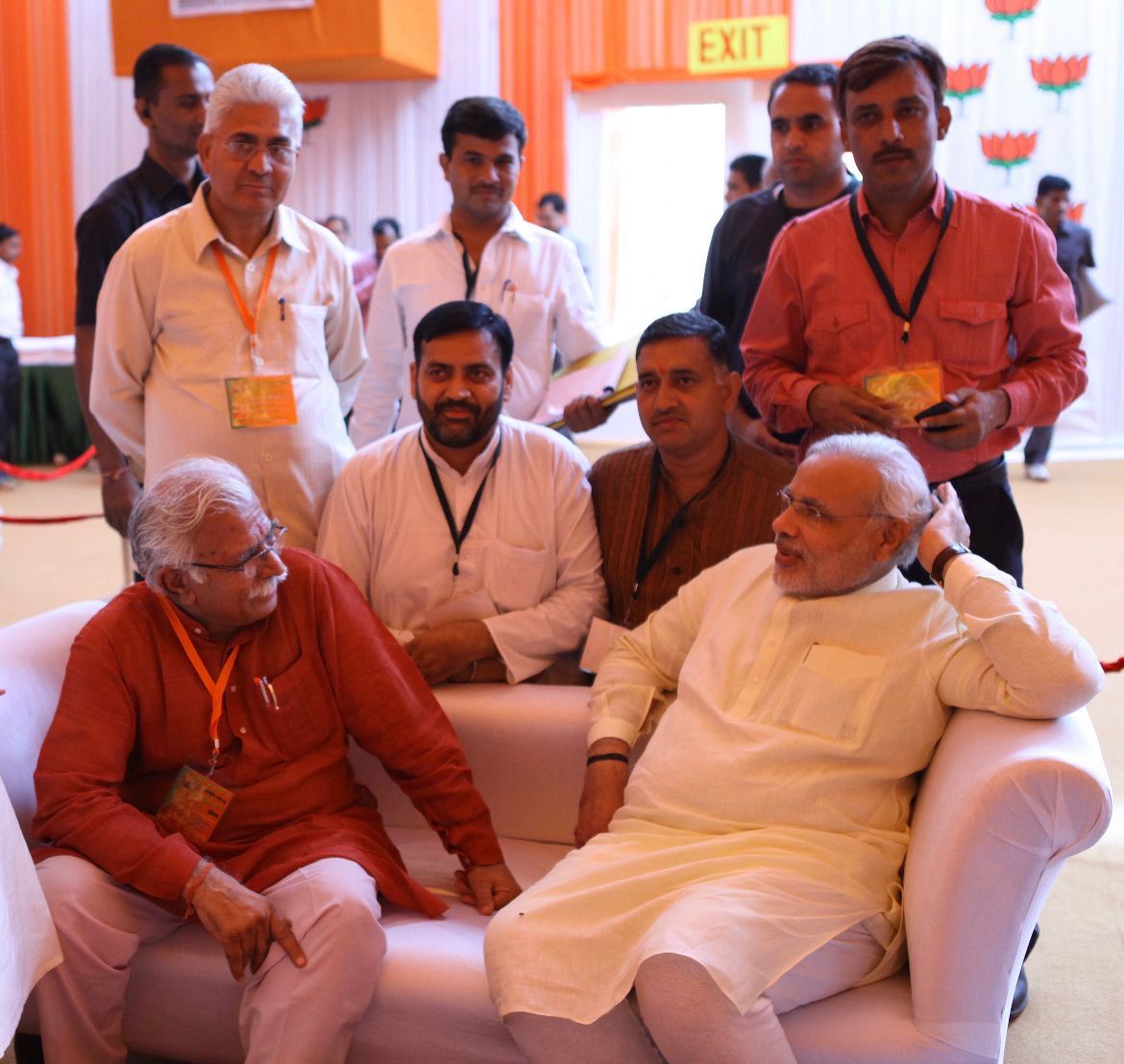 सितंबर 2012 में फरीदाबाद के सूरजकुंड में आयोजित भाजपा के राष्ट्रीय अधिवेशन में गुजरात के तत्कालीन मुख्यमंत्री और मौजूदा प्रधानमंत्री नरेन्द्र मोदी के साथ सोफे पर बैठे मंत्रणा करते हुए मनोहर लाल, इनके पीछे बैठे हुए सफेद कुर्ता पाजामा में नायब सैनी खड़े दिखाई दे रहे हैं।