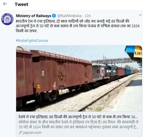 कोरोना संकट के बीच भारतीय रेलवे ने इतिहास रच दिया है। 88 वैगन की मालगाड़ी ने 50 घंटे में 1634 किमी का सफर तय कर खाद्यान्न पहुंचाया। इसका नाम अन्नपूर्णा ट्रेन रखा गया है।