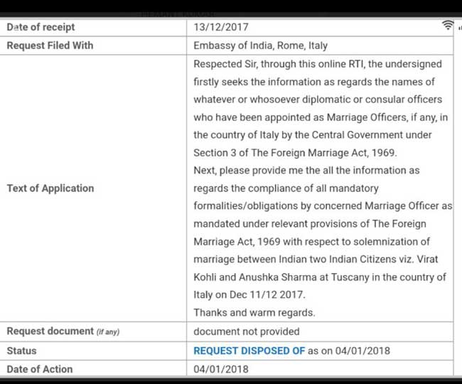 एडवोकेट हेमंत कुमार ने 13 दिसंबर को विदेश मंत्रालय में आरटीआइ लगाकर पूछा कि विदेशी विवाह अधिनियम-1969 के तहत विदेश में शादी करवाने के लिए भारत की ओर से किस विवाह अधिकारी को नियुक्त किया गया। दूसरे प्रश्न में पूछा गया कि क्या विराट कोहली-अनुष्का की शादी विदेशी विवाह अधिनियम-1969 के तहत हुई है या नहीं। मामला इटली से जुड़ा था, इसलिए विदेश मंत्रालय ने 14 दिसंबर को यह आरटीआइ रोम स्थित भारतीय दूतावास में ट्रांसफर कर दी।
