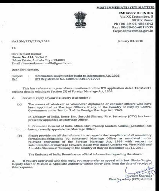 एडवोकेट हेमंत कुमार ने बताया कि सरोम स्थित भारतीय दूतावास की ओर से 4 जनवरी को आरटीआइ का जवाब दिया गया। इसमें पहले प्रश्न के जवाब में बताया गया है कि रोम में भारतीय विदेश मंत्रालय की ओर से सरूचि शर्मा और मिलान में प्रदीप गौतम को मैरिज आफिसर नियुक्त किया हुआ है। दूसरे प्रश्न के जवाब में लिखा है कि विराट कोहली-अनुष्का की शादी के बारे में रोम स्थित भारतीय दूतावास में अधिकारिक तौर पर कोई जानकारी नहीं है।