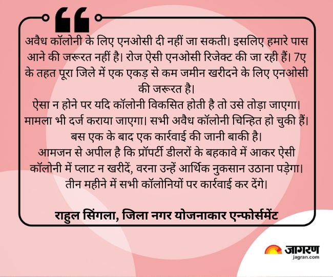 जो एनओसी आई हैं या आ रही हैं, वह सभी रिजेक्ट कर दी गई हैं। जिला नगर योजनाकार एन्फोर्समेंट विभाग की टीमों ने ऐसी कालोनियों का सर्वे कर लिया है। 100 से अधिक कालोनी चिन्हित कर इन पर कार्रवाई करने का शेड्यूल तैयार है। कार्रवाई की शुरूआत अनंगपुर व इस्माइलपुर में हुई मंगलवार को हो चुकी है।