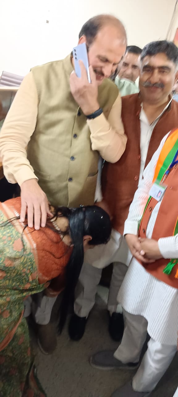 भाजपा की मेयर पद की प्रत्याशी प्रवीण बत्रा जोशी विजयी होने के बाद पति संदीप जोशी के पैर छूकर आशीर्वाद लेती हुईं। संदीप जोशी भाजपा की राष्ट्रीय परिषद के सदस्य हैं।