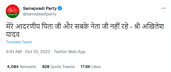 समाजवादी पार्टी के राष्ट्रीय अध्यक्ष और उत्तर प्रदेश के पूर्व मुख्यमंत्री अखिलेश यादव ने ट्वीट कर अपने पिता के निधन की पुष्टि की है।