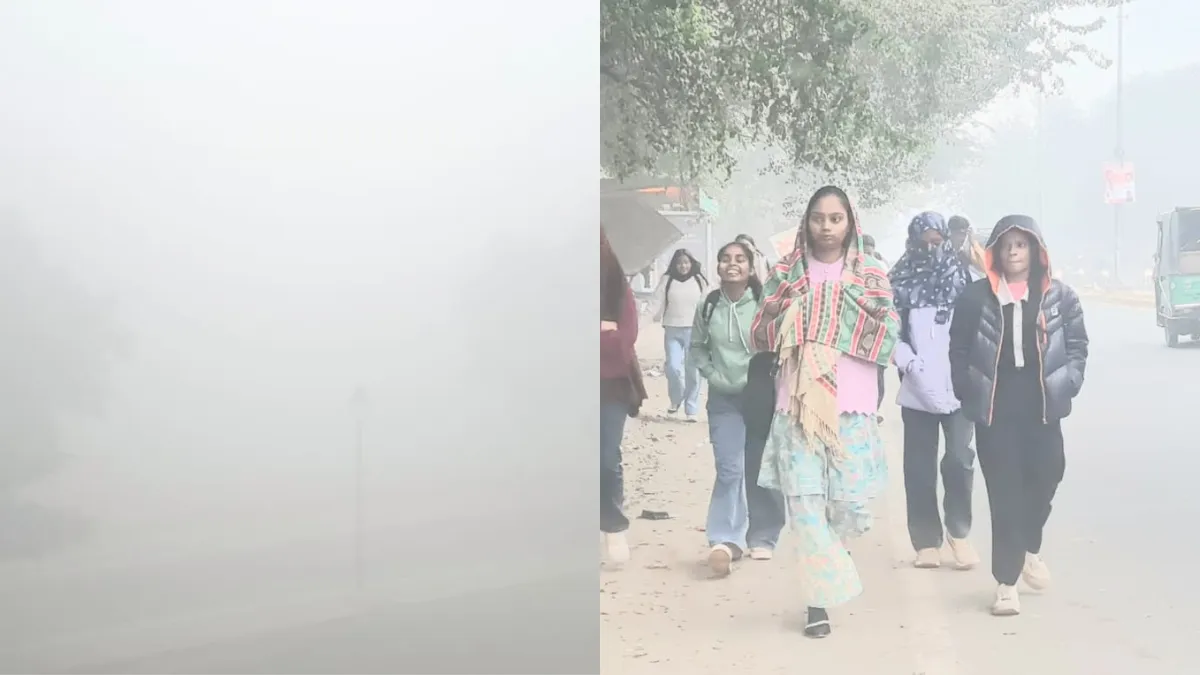 गुरुग्राम में घने कोहरे की चादर के बीच कॉलेज जाती छात्राएं। जागरण
