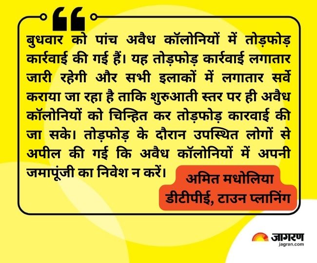 टाउन प्लानिंग के डीटीपीई अमित मधोलिया ने बताया कि बुधवार को पांच अवैध कॉलोनियों में तोड़फोड़ कार्रवाई की गई हैं। यह तोड़फोड़ कार्रवाई लगातार जारी रहेगी और सभी इलाकों में लगातार सर्वे कराया जा रहा है ताकि शुरुआती स्तर पर ही अवैध कॉलोनियों को चिन्हित कर तोड़फोड़ कारवाई की जा सके। तोड़फोड़ के दौरान उपस्थित लोगों से अपील की गई कि अवैध कॉलोनियों में अपनी जमापूंजी का निवेश न करें।
