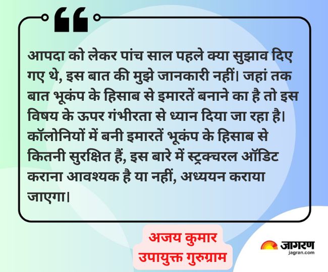 मैंने ही हरियाणा लोक प्रशासन संस्थान में आपदा प्रबंधन विभाग का अध्यक्ष रहते प्रशासन को सुझाव दिया था कि भूकंप के हिसाब से सभी इमारतों का स्ट्रक्चरल आडिट कराया जाए। इसके ऊपर अब तक ध्यान नहीं दिया गया है। थाईलैंड व म्यांमार की तबाही से सबक लेना चाहिए अन्यथा यदि सात तीव्रता का भूकंप आया फिर ऐसी तबाही मचेगी, जिसकी कल्पना नहीं कर सकते। गुरुग्राम अतिसंवेदनशील जोन चार में आता है। क्या स्ट्रक्चरल आडिट पर ध्यान तबाही मचने के बाद दिया जाएगा।