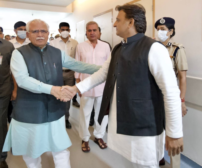 हरियाणा के सीएम ने बताया कि उन्होंने उत्तर प्रदेश के पूर्व मुख्यमंत्री और मुलायम सिंह यादव के बेटे अखिलेश याद और परिवार के सदस्यों से मुलाकात की। सीएम ने कहा कि अभी भी मुलायम सिंह यादव रिस्क जोन में है। मगर पहले से हालत में सुधार है।