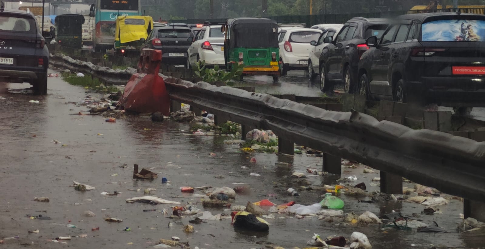 गुरुग्राम में दिल्ली जयपुर हाईवे की सर्विस लेन वर्षा के बाद हुई ओवरफ्लो और इस तरह कचरा तैर कर हाईवे और सर्विस लेन आ गया।