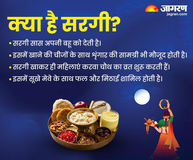 करवा चौथ पर सरगी का खास महत्व होता है। सरगी सास अपनी बहू को देती है। इसमें खाने की चीजों के साथ शृंगार की सामग्री भी मौजूद होती है। सरगी खाकर ही महिलाएं करवा चौथ का व्रत शुरू करती हैं। इसमें सूखे मेवे के साथ फल और मिठाई शामिल होती हैं।