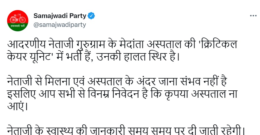 समाजवादी पार्टी (Samajwadi Party, सपा) के ऑफिशियल ट्विटर अकाउंट ने जानकारी दी कि नेताजी गुरुग्राम के मेदांता अस्पताल की 'क्रिटिकल केयर यूनिट' में भर्ती हैं, उनकी हालत स्थिर है। नेताजी से मिलना एवं अस्पताल के अंदर जाना संभव नहीं है, इसलिए आप सभी से विनम्र निवेदन है कि कृपया अस्पताल ना आएं। नेताजी के स्वास्थ्य की जानकारी समय समय पर दी जाती रहेगी।