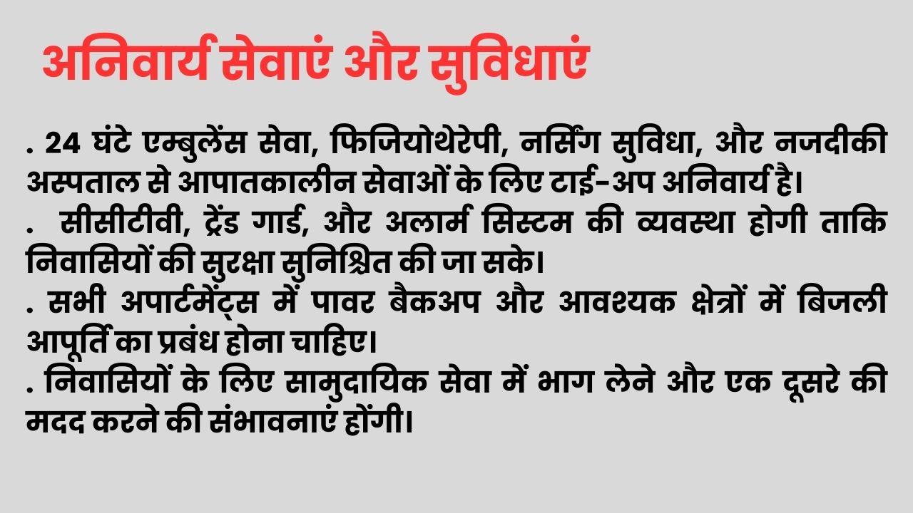 - किसी भी प्रोजेक्ट में 100 वर्ग मीटर का भोजनालय, मेडिकल रूम, और 500 वर्ग मीटर का जिम, इंडोर गेम्स, और सामान्य कक्ष होना अनिवार्य है।