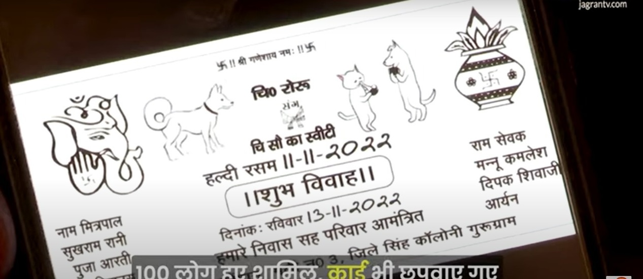 पालम विहार एक्सटेंश की जिले सिंह कॉलोनी में रहने वाले पालतू जानवरों के मालिकों ने बताया कि पालूत नर-मादा कुत्ते की शादी के लिए 100 लोगों के लिए आमंत्रण भी भेजा था। लोग कुत्तों की शादी में बाराती के रूप में भी शामिल हुए थे।