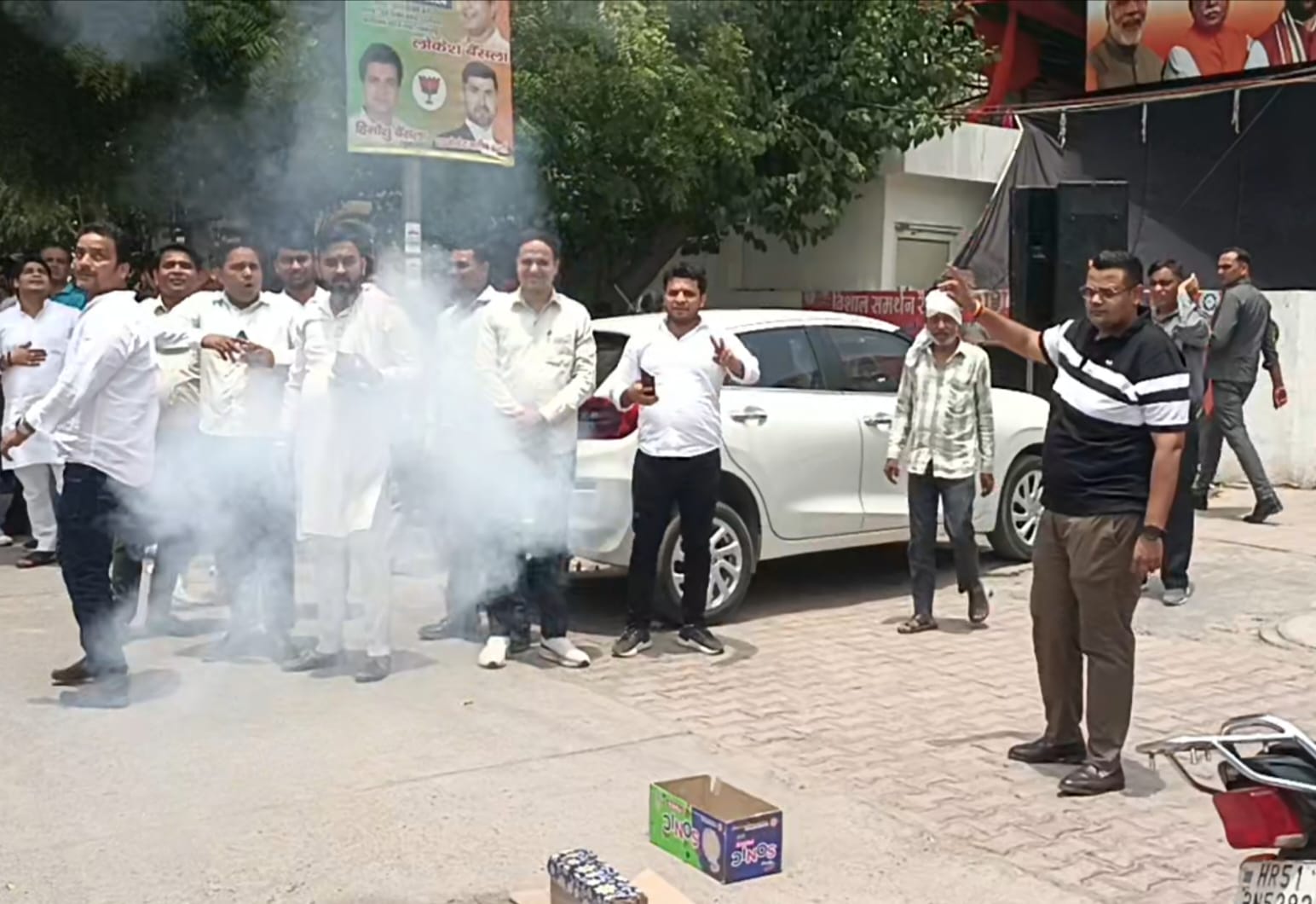 फरीदाबाद : सेक्टर 28 स्थित भाजपा कार्यालय पर आतिशबाजी करते कार्यकर्ता