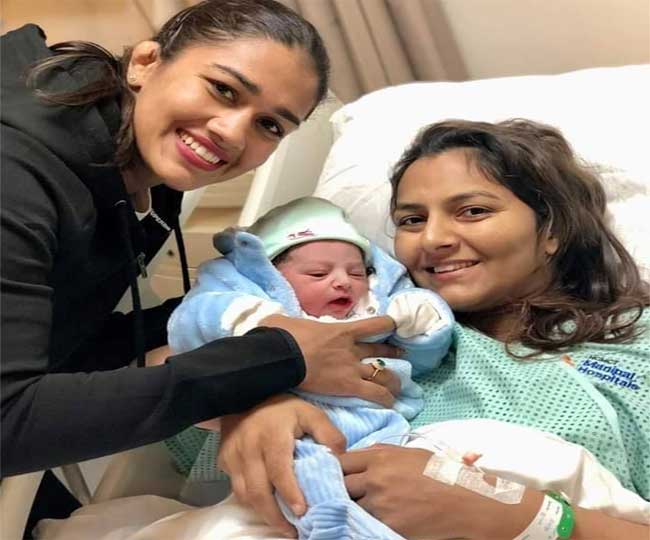 गीता फौगाट और उनके नवजात पुत्र के साथ बबीता फौगाट।