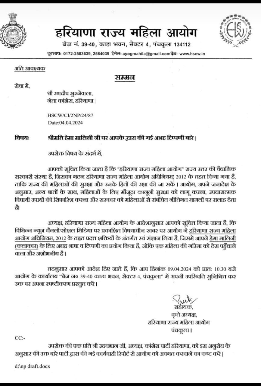 Haryana Latest News मथुरा से सासंद हेमा मालिनी पर अभद्र टिप्पणी मामले में हरियाणा राज्य महिला आयोग ने कांग्रेस नेता रणदीप सुरजेवाला को सम्मन भेजा है। सम्मन के अनुसार हरियाणा राज्य महिला आयोग ने सासंद हेमा मालिनी पर हुईं टिप्पणी को अशोभनीय बताया है। सम्मन में सुरजेवाला द्वारा की गई टिप्पणी को महिला की गरिमा को ठेस पहुंचाने वाला बताया गया है।