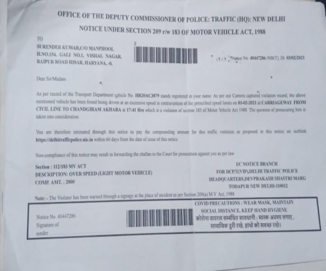 दिल्ली पुलिस की ओर से सुरेंद्र कुमार के घर भेजा गया चालान।