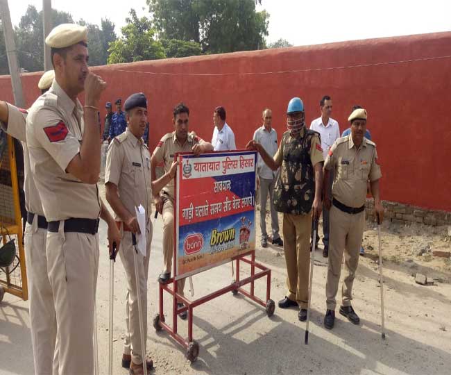 हिसार के सेंट्रल जेल के पास तैनात पुलिसकर्मी।