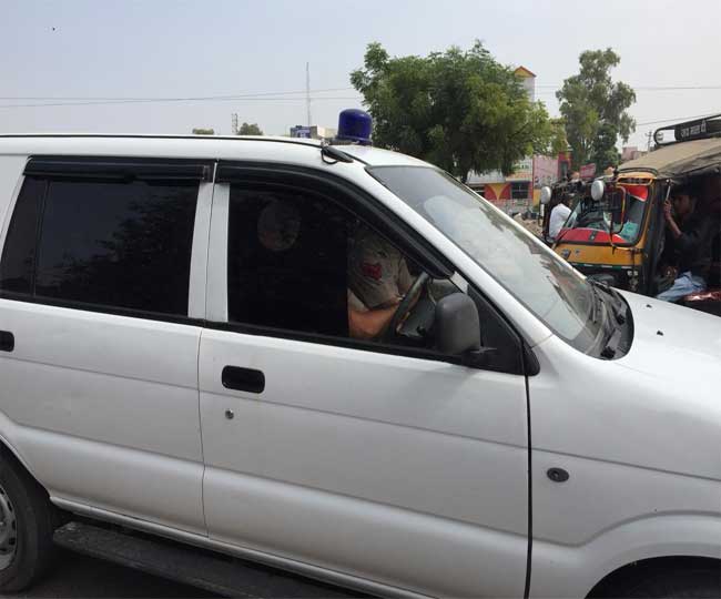 रामपाल को गाड़ी में लेकर विशेष अदालत में पेश करने के लिए पहुंची पुलिस।