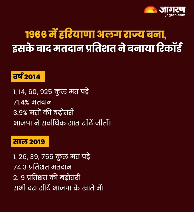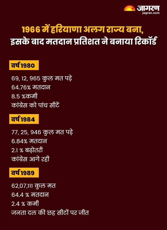 लोकतांत्रिक देश में जनता के वोटिंग का अधिकार काफी महत्वपूर्ण है। वहीं साल 1952 में प्रथम लोकसभा चुनाव में हरियाणा पंजाब में ही सम्मिलित था। उस दौरान वोटिंग प्रतिशत 57.93 फीसदी था। लेकिन साल 1966 में हरियाणा पंजाब से अलग हो गया। इसके बाद मतदान के प्रतिशत का रिकॉर्ड काफी बढ़ा है और सात दशकों बाद मतदान प्रतिशत 70 फीसदी के पार पहुंच गया है।