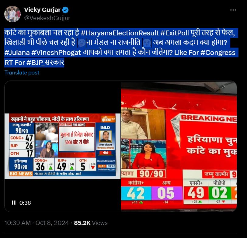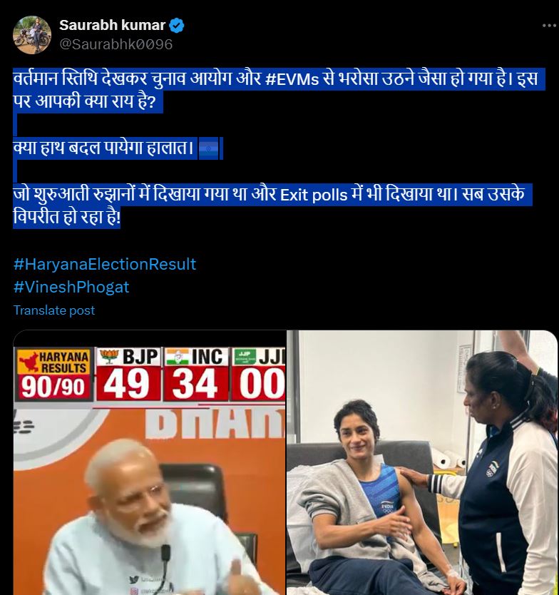 इसी बीच एक अन्य यूजर ने लिखा कि कांटे का मुकाबला चल रहा है। हरियाणा चुनाव परिणाम में पूरी तरह से फैल, खिलाडी भी पीछे चल रही हैं न मेडल ना राजनीति। अब अगला कदम क्या होगा? जुलाना में विनेष फोगाट को लेकर आपको क्या लगता है क्या होगा।