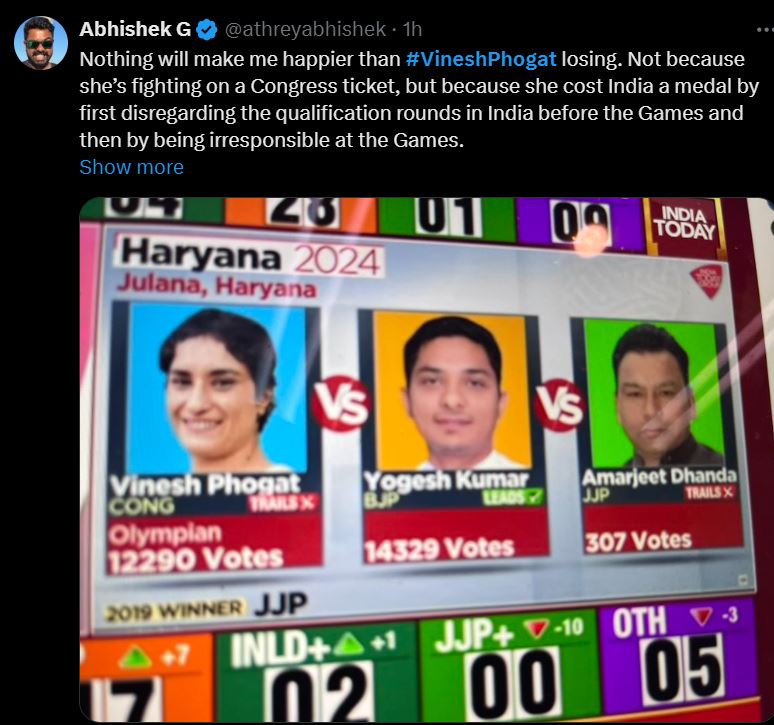 एक अन्य यूजर ने लिखा विनेष की हार से ज्यादा खुशी मुझे कुछ नहीं होगी। इसलिए नहीं कि वह कांग्रेस के टिकट पर लड़ रही हैं, बल्कि इसलिए कि उन्होंने खेलों से पहले भारत में क्वॉलीफिकेशन राउंड की उपेक्षा करके और फिर खेलों में गैर-जिम्मेदार होकर भारत को पदक दिलाया।