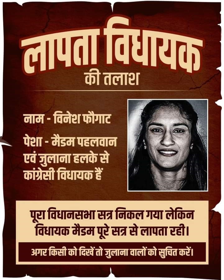 हरियाणा के जुलाना हलके से कांग्रेस विधायक और अंतरराष्ट्रीय पहलवान विनेश फोगाट के गुमशुदगी के पोस्टर सोशल मीडिया पर वायरल हो रहे हैं। विपक्ष के लोग पोस्टर पर चुटकियां भी ले रहे हैं। विनेश फोगाट ने कुश्ती के बाद राजनीति में कदम रखते ही विरोधियों को चित तो कर दिया लेकिन अब सत्र के दौरान विधानसभा में नहीं पहुंचने से जुलाना के लोग काफी आक्रोशित हैं।