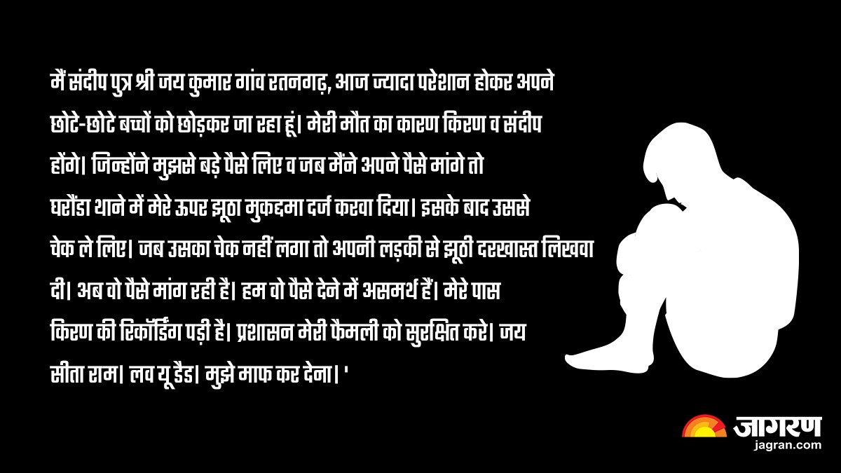 करनाल, जागरण संवाददाता: एक दंपत्ति से परेशान होकर युवक ने सल्फास खाकर आत्महत्या कर ली और एक सुसाइड नोट भी मिला है। इस सुसाइट नोट के आधार पर पुलिस ने दंपत्ति और एक युवक पर आत्महत्या के लिए मजबूर करने का मामला दर्ज किया है। सुसाइट नोट में युवक ने लिखा था कि मैं बहुत ज्यादा परेशान होकर अपने छोटे-छोटे बच्चों को छोड़कर जा रहा हूं। मेरी मौत का कारण किरण व संदीप होंगे। लव यू डैड, मुझे माफ कर देना, जय सीता राम।