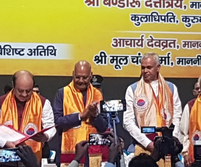कुरुक्षेत्र, जागरण संवाददाता। कुरुक्षेत्र विश्वविद्यालय के 33वें दीक्षांत समारोह का आज आयोजन किया गया। कार्यक्रम में मुख्य अतिथि पूर्व राष्ट्रपति रामनाथ कोविंद थे। वहीं, हरियाणा के राज्यपाल बंडारू दत्तात्रेय, मुख्यमंत्री मनोहर लाल और गुजरात के राज्यपाल आचार्य देवव्रत ने शिरकत की।