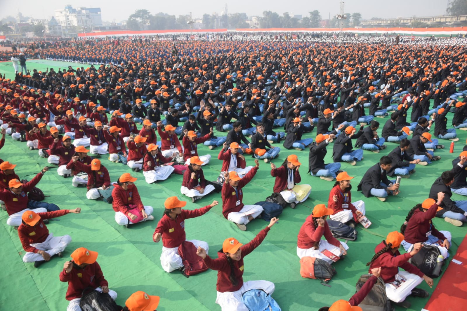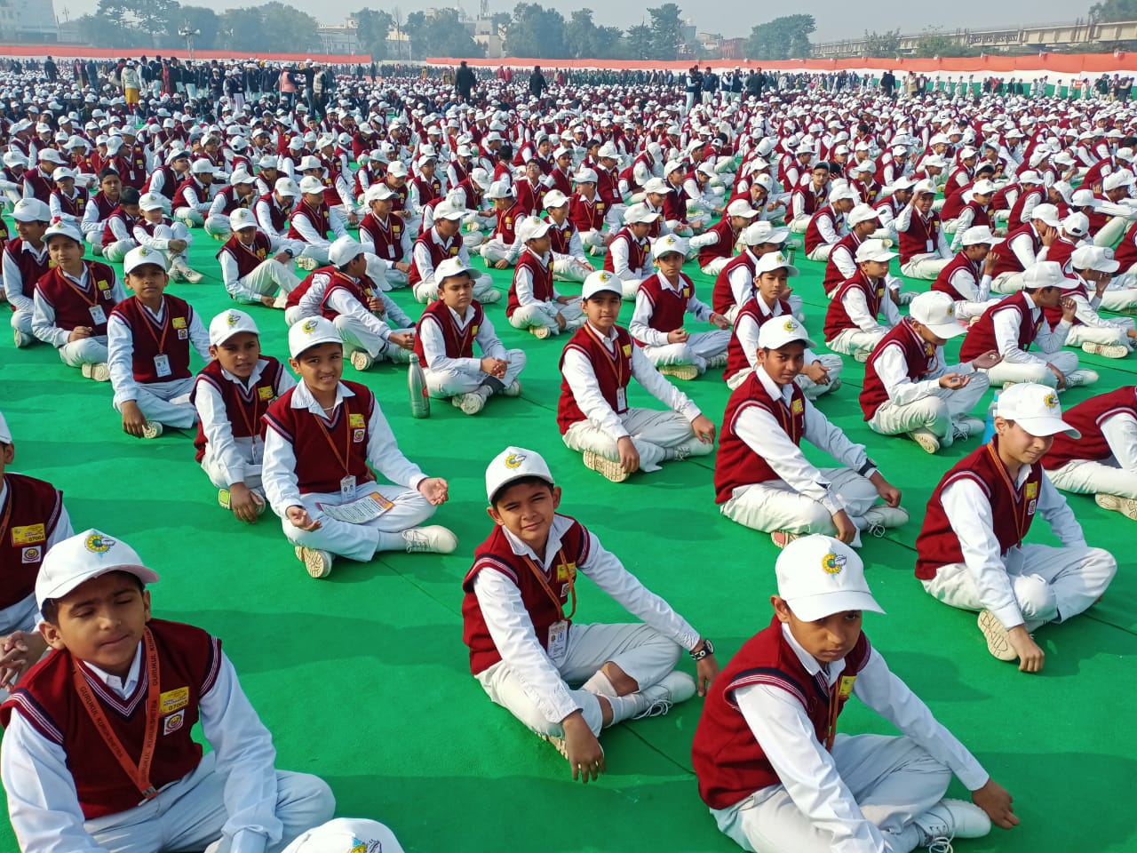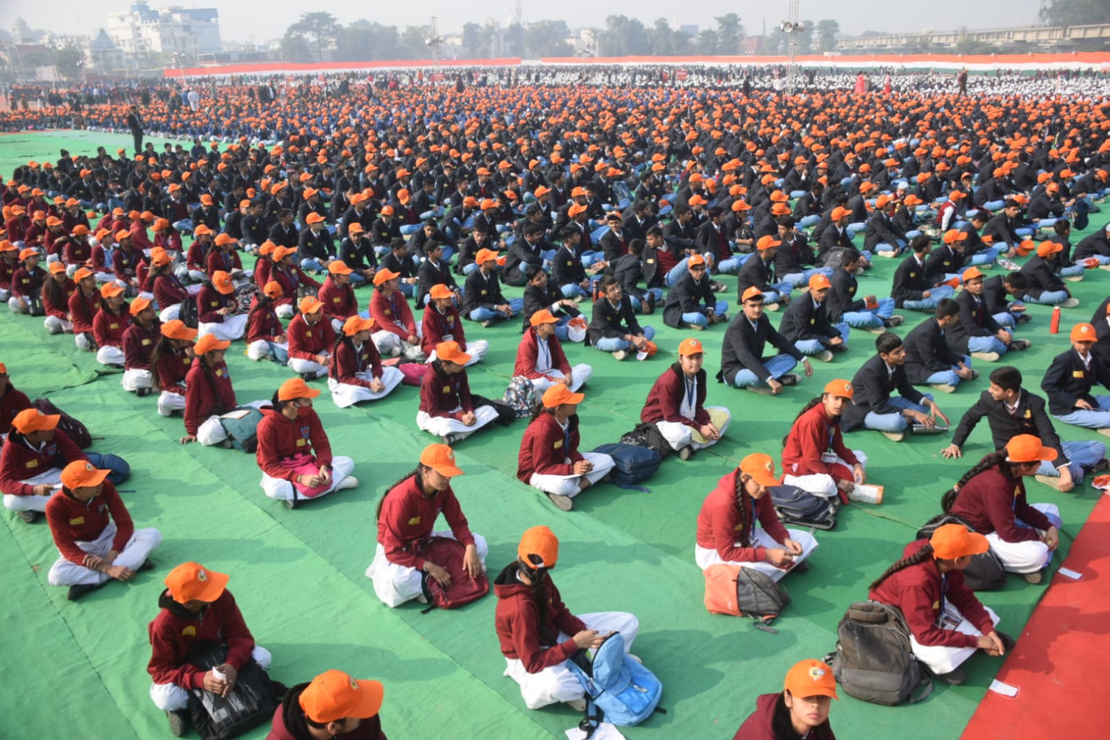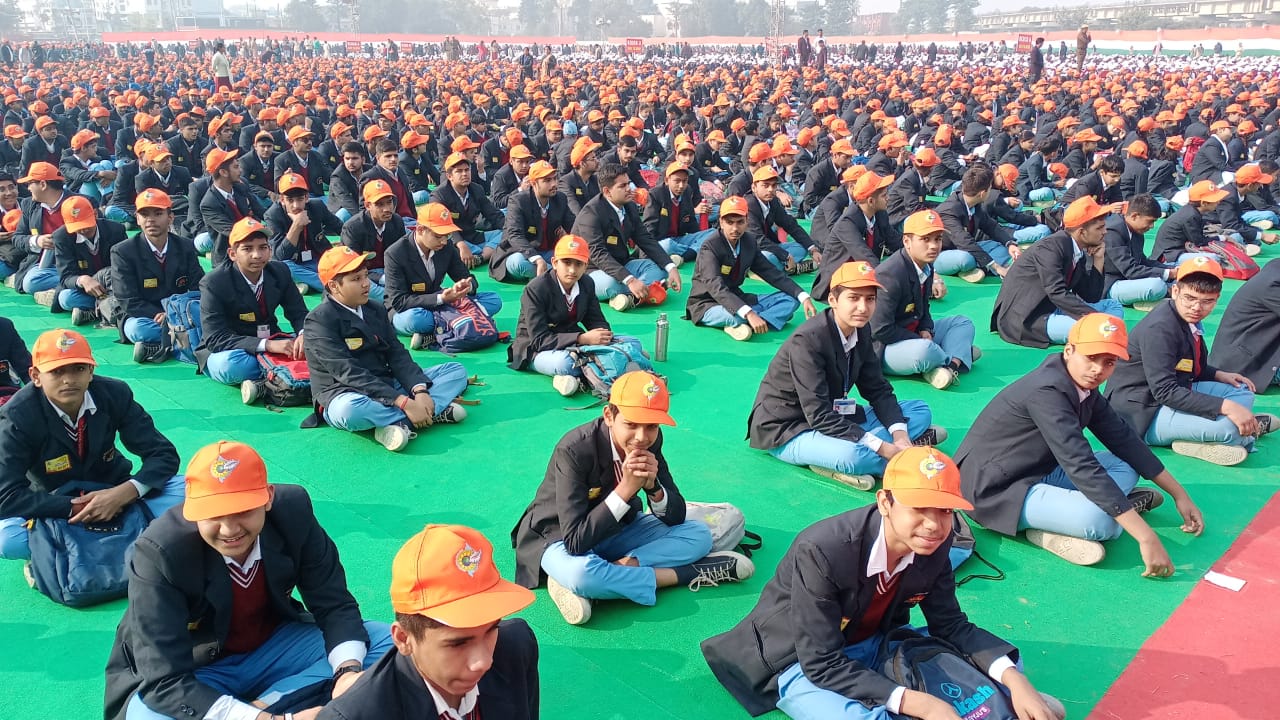 कुरुक्षेत्र में वैश्विक गीता पाठ के लिए बैठे विद्यार्थी।