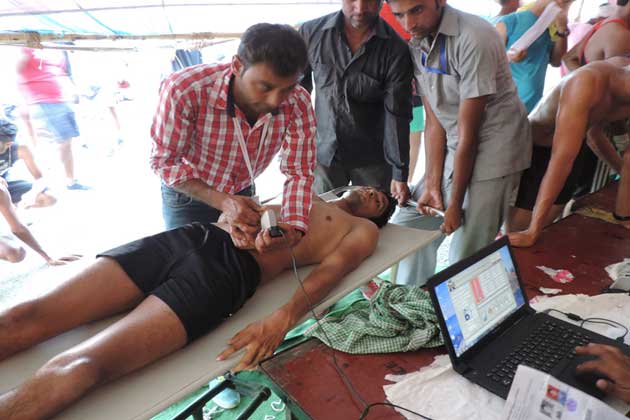 बेहोश हुए एक प्रतिभागी की चिकित्सा करते स्वास्थ्य कर्मी।